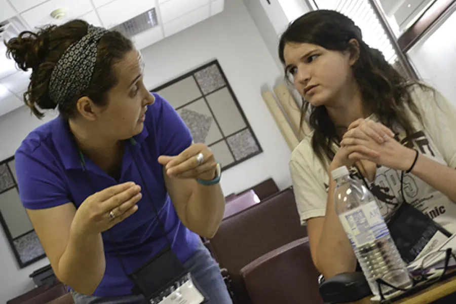 | GLAM Co-Coordinator Kaitlin Tyler discusses chocolate with a GLAM GAMES camper during the "The Material Science of Chocolate" activity. |